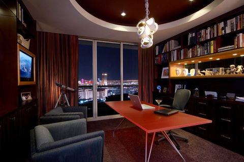 At first glance, this 35th floor high-rise condo embodies an upscale Las Vegas ultra-lounge. It’s rich. It’s cultured. It’s chic. This space is enveloped in a brilliant blend of deep reds, African woods, mirrors and technology. Entering from the private elevator foyer, the owners and guests are welcomed with bold, plum stone flooring with highly reflective speckles that resemble diamonds and contemporary, dark wood French doors with red glass inserts. The original architecture was modified to make use of dead space and create a multi-dimensional atmosphere. As you enter the home, your eyes are immediately drawn to the sculptural paneled wall which is complemented by an LED light system that can be color controlled by the couple to either set “the mood” or to better entertain their unsuspecting guests.