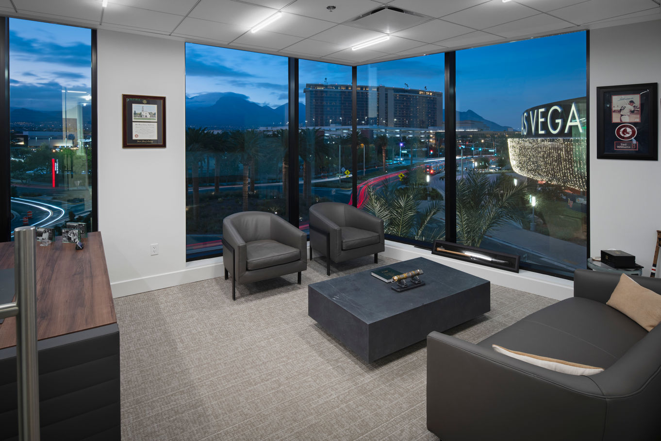 The office was designed around a central corridor with expansive transparent glass walls to maintain an open and inviting space. The offices branch off the corridor to maximize the framed views provided by the panelized exterior façade system, focusing on capturing the corner moment for great views of the Las Vegas Ballpark. The primary interior finish selected was a large format porcelain tile, which provides a clean, uniform, and uninterrupted basis to which we added floor-to-ceiling glazing systems at the offices, a customized wood grille ceiling with acoustic backing, an acoustic ‘hard-lid’ ceiling system, integrated lighting solutions, and high-end fixtures and equipment.